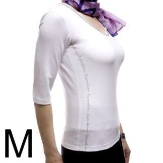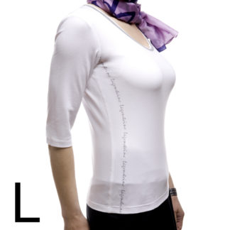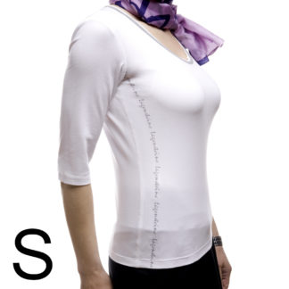White, elegant women’s shirt in high-quality jersey quality with logo lettering on one side, gray decorative piping around the neckline, three-quarters arm length.